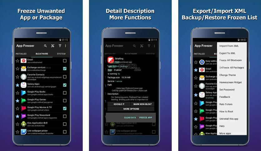 This helpful app helps you freeze/hide unwanted applications or packages, make them disappear, save your RAM usage and battery life, and improve your performance. All frozen packages are marked unavailable from running and updating. One tap to freeze/unfreeze all Bloatware (pre-installed apps).