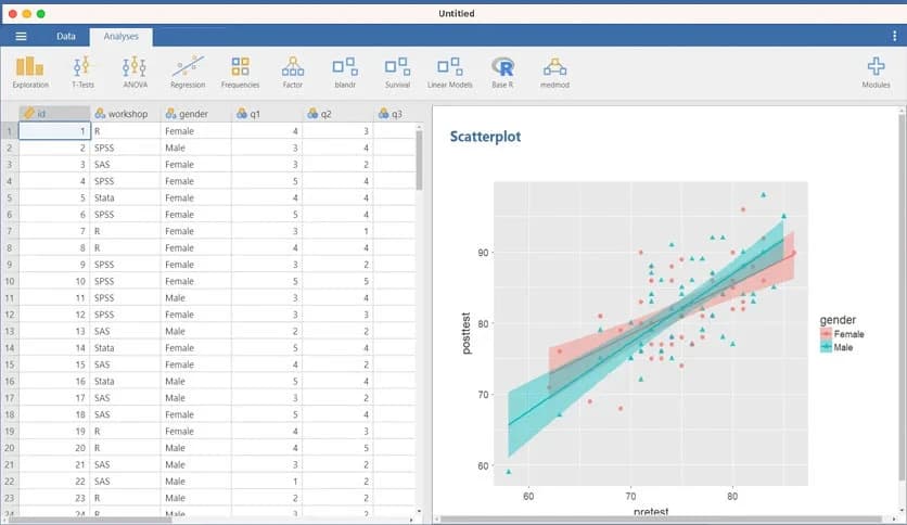 It provides a comprehensive set of tools for data manipulation, statistical analysis, and visualization. It supports various statistical techniques, including t-tests, ANOVAs, regression, and factor analyses. The software's intuitive interface makes importing data, performing analyses, and visualizing results easy.