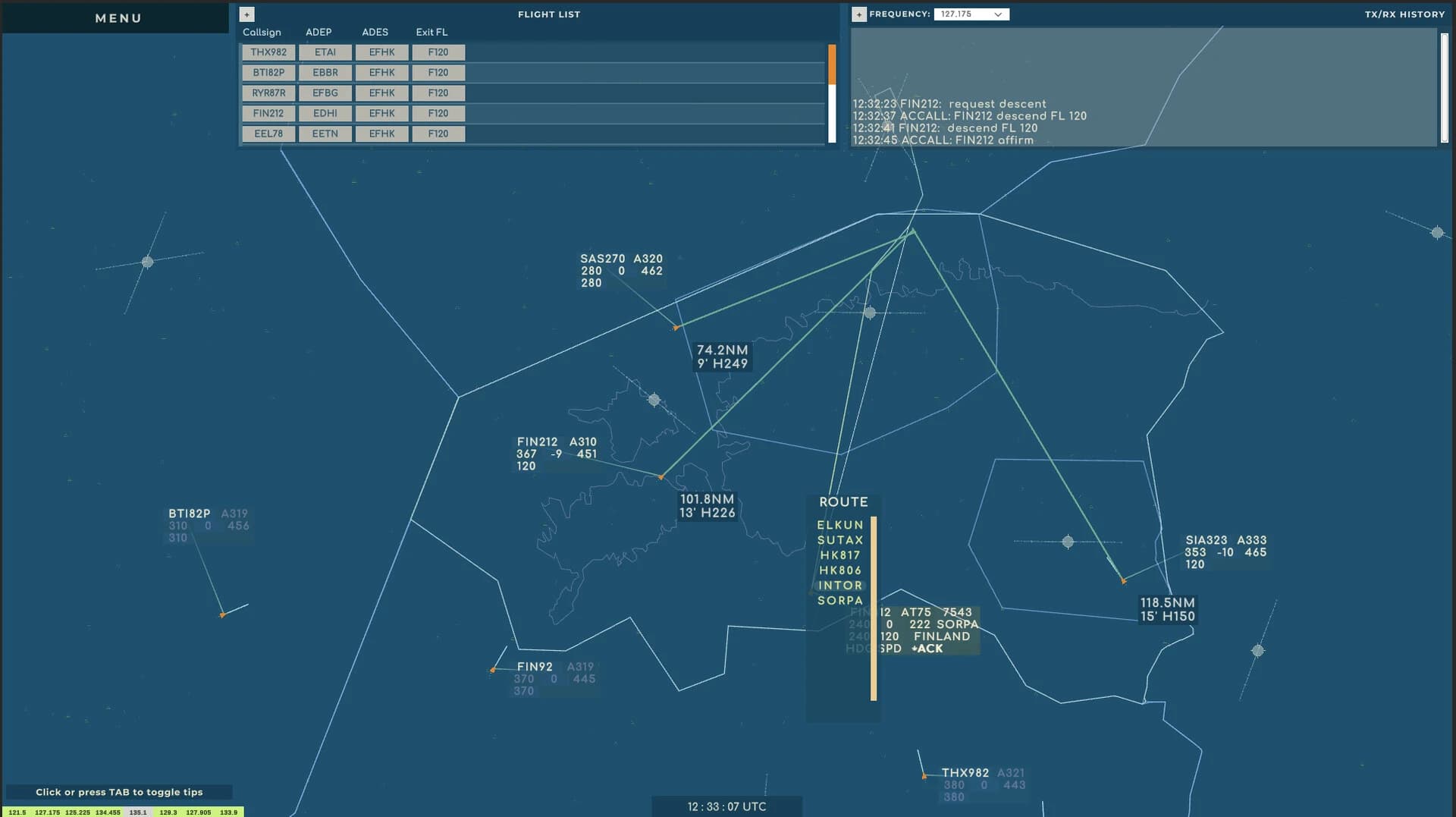 The game’s interface replicates professional radar systems with aircraft labels, conflict measurement tools, and wind information. Players use these elements to issue clearances, respond to pilot requests, and coordinate with neighboring sectors.