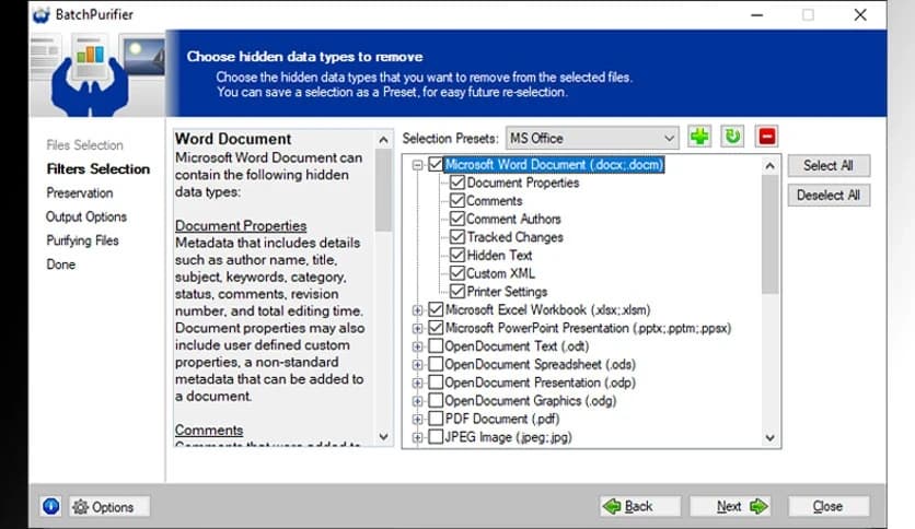 One notable feature of this software is its ability to remove hidden data from files compressed within ZIP files. Additionally, it can efficiently eliminate confidential data from JPEG and PNG image files embedded in Microsoft Office documents. This broad range of capabilities makes it a versatile solution for individuals and organizations concerned about unintentional data exposure.