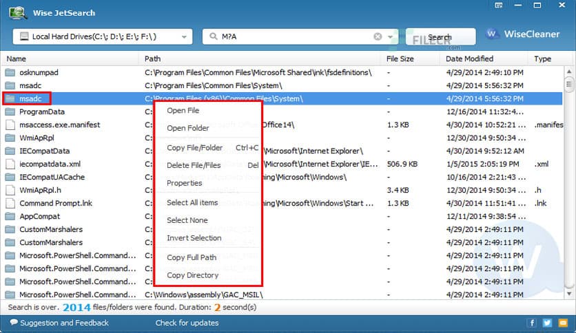 Input your keywords, select the drive and then start to search. After searching, Wise JetSearch will show you the searching results such as file/folder name, path, size, and last modified date. Also, a right-click can provide you with a direct and convenient way to deal with the file/folder you found out.